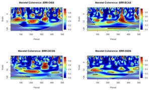 The discussion of the empirical results begins with the wavelet correlation plots of oil shocks and Nigerian exchange rates over different wavelet scales, as reported in Figure 1. The correlation between Nigerian exchange rate returns and oil shock measures is not consistent across different periods. While there is a negative correlation between oil supply shocks and exchange rate returns as well as between oil consumption demand shocks and exchange rate returns in the short run, the opposite is true for economic activity shocks and oil inventory demand shocks with exchange rate returns. However, there is evidence of a negative correlation between exchange rate returns and all the measures of oil shocks in the very long-run period, except for ERR-OICDS, which has a positive correlation in the long-run and very long-run. This implies a heterogeneous correlation between exchange rate returns and oil shock indicators across different wavelet scales, with prominent negative relationships in the long-run horizon except for OICDS.