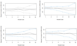 From Equation (1), the two continuous wavelet transforms of and are denoted by and respectively; and and denote the measure and is the combined conjugate. Furthermore, denotes the cross-wavelet transforms that generate the cross-wavelet power. This transformation allows the estimation to be decomposed into time and frequency domains, with the time phase illustrating the progression of the time series sequence at each measurement point. Additionally, the relationship between the variables is examined using wavelet coherence within both the time and frequency dimensions by calculating the adjusted wavelet coherence coefficient, as proposed by Torrence & Webster (1999) and modified by Afshan et al. (2018), as follows: