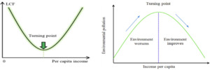 This investigation utilizes panel data from 23 Euro-Mediterranean countries/cross-sections (Albania, Bosnia and Herzegovina, Algeria, Morocco, France, Croatia, Montenegro, Cyprus, North Cyprus Turkish Republic, Libya, Lebanon, Egypt, Malta, Monaco, Slovenia, Syria, Tunisia, Turkey, Vatican City, Greece, Spain, Israel, Italy) spanning the years 2000 to 2019. The Load Capacity Factor (LCF) is employed as an indicator of environmental integration. LCF is calculated as the ratio of biocapacity to the ecological footprint, providing a comprehensive measure of the overall demand for ecological resources in relation to their supply. Contrary to the Environmental Kuznets Curve, which illustrates an inverted U-shape, the load capacity curve hypothesis is graphically depicted as a perfect U-shape. This suggests that environmental security deteriorates at lower levels of economic growth and improves beyond a certain income threshold, enhancing environmental sustainability. This relationship is illustrated in Figure 1.