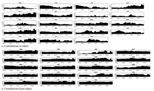 This index measures the degree to which a shock in one variable spills through other variables. The “total directional connectedness to others” quantifies the shock transmitted from variable i to all other variables j, calculated as: