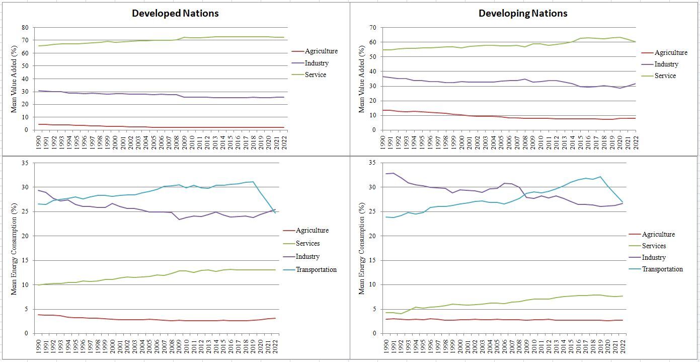 Energy demand is rising across nearly all sectors of the economy due to factors such as population growth, increasing consumer needs, energy-intensive industries, transportation expansion, and globalization. In this paper, we explore whether the growth in energy consumption among different sectors—agriculture, industry, services, and transportation—affects the overall energy intensity of developed and developing economies in varied ways. The effectiveness of energy conservation is often measured using both energy consumption and energy intensity as dual indicators (Yan et al., 2022). Rising energy consumption in different sectors can negatively affect an economy if sustainable practices are not adopted to improve energy intensity. For example, excessive energy use in agriculture can cause environmental harm, including increased greenhouse gas emissions and water degradation (Wu & Ding, 2021). Sectoral energy consumption insights may differ from those based on national-level data (Smyth & Narayan, 2015). The industrial sector is typically highly energy-intensive, while the transportation sector’s intensity varies depending on transport modes and fuel types; agriculture generally falls somewhere in the middle. If a certain energy intensity threshold is surpassed, increased energy consumption can hinder economic growth (Aydin & Esen, 2018). Therefore, new energy policies should carefully consider energy intensity.