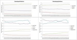 The data on sectoral shares of energy consumption as a percentage of total energy consumption (EC), which is our main independent variable, was obtained from the OECD database. The data on energy intensity (EI)—the amount of primary energy used per unit of economic output (MJ/$), which serves as our main dependent variable—was sourced from the International Energy Agency (IEA) and the United Nations Statistics Division (UNSD). We used renewable energy supply (REN) (as a percentage of total energy supply) and population per 1,000 inhabitants (POP), both sourced from the OECD database, as well as the Human Development Index (HDI) from the United Nations Development Programme (UNDP) Human Development Report, as control variables. The trend of the share of value added and share of energy consumption in different sectors for developed and developing countries is presented in Figure 1.
