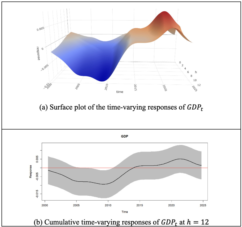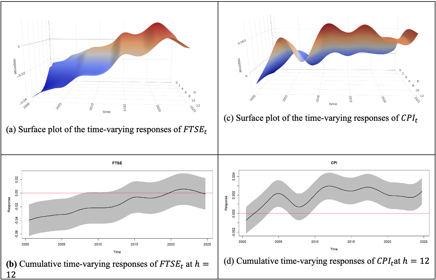 The time-varying responses are consistent with the linear responses, confirming the significant impact of climate risk on the UK economy. However, the results demonstrate that the magnitude of these responses evolves over time.