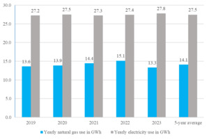 Figure 1 shows the yearly energy use between 2019 and 2023, including electricity and natural gas. Electricity is used for medical equipment, office equipment and all building services, e.g., air conditioning systems, lighting, and lifts. The average yearly consumption of electricity is 27.5GWh. This yearly usage is relatively stable, varying between 27.2GWh in 2019 and 27.8GWh in 2023.