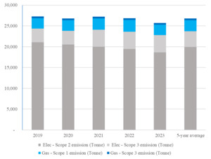 We observe that the usage of electrical energy almost doubles that of natural gas in the hospital, with yearly averages of 27.5GWh and 14.1GWh, respectively. Their 5-year average data are used for the costing analysis in the following section. Correspondingly, the hospital’s energy emissions are dominated by electricity use. Figure 2 shows the emissions of Scopes 1-3. Scope 2 emissions account for the majority of these emissions, primarily from purchased grid electricity for medical and building services, such as building cooling/heating, and lighting. Scope 1 emissions from natural gas consumption are approximately equal to Scope 3 emissions from electricity use, being less than one-fifth of Scope 2 emissions from electricity use. Scope 3, which involves natural gas consumption, is the smallest component. Over the five-year period from 2019 to 2023, emissions decreased, albeit modestly, with an average annual reduction of approximately 4%.