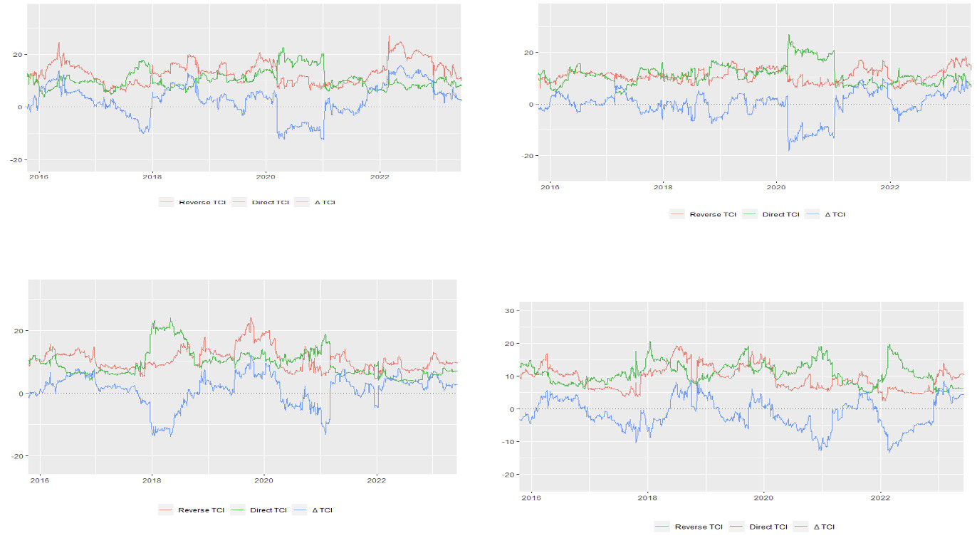 A direct quantile relationship links high (low) quantiles of X with high (low) quantiles of Y, while an inverse relationship links high quantiles of X to low quantiles of Y. The Total Connectedness Index (TCI) measures overall interdependence, with higher values indicating stronger spillovers. TCI captures how cross-market connections change under varying and extreme market conditions.