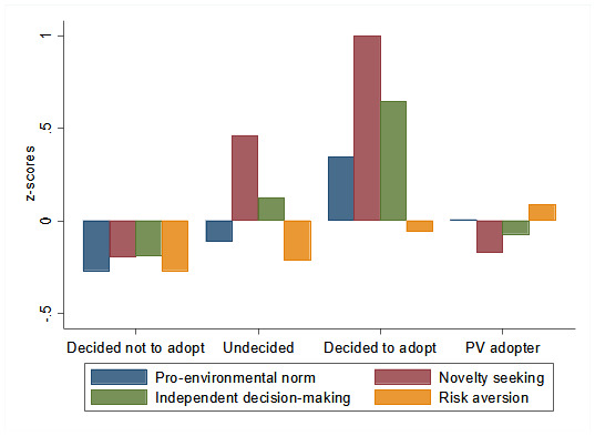 We find that PV adopters have a lower degree of novelty seeking and independent decision making compared to considerers who are undecided and considerers who decided to adopt but have not yet signed a contract. Although studies such as that of Lundheim et al. (2021) show that individuals drawn to new products and technologies are more likely to develop strong interest in solar adoption, our results suggest that, compared to considerers, solar adopters are less drawn to new products and technologies. Thus, even if novelty seeking helps explains why homeowners become interested in solar, these intentions may not be enough to explain the decision to immediately adopt PV.