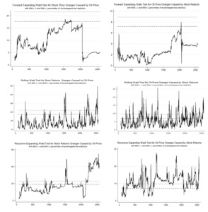 Table 3 presents the results of the linear and time-varying causality tests between oil returns and stock returns in Norway. For the linear causality, we use the Toda-Yamamoto Granger-non-causality test. The results for the weekly and monthly data show the existence of unidirectional causality running from stock returns to oil returns. However, the results from the daily data show that the causality runs from both sides—that is, from oil returns to stock returns and vice versa. When we apply the time-varying causality test, the results are a bit different for the daily and weekly data but are same for the monthly data irrespective of the algorithm procedures employed. Specifically, the results show that, though causality varies between oil returns and stock returns overtimes, the variability is dominated by unidirectional causality from stock returns to oil returns. This indicates that stock returns have predictive power over oil returns. This could be attributed to the fact that energy companies also trade in the stock market. Hence, whatever happens in the stock market, especially in the course of trading, could affect energy price. For weekly data, only the rolling algorithm procedure shows bidirectional causality between oil returns and stock returns. The recursive expanding algorithm procedure results show the existence of unidirectional causality that runs from oil returns to stock returns. However, the forward expanding algorithm procedure shows that there is no causality between oil returns and stock returns. For the daily data results, both the forward and rolling algorithm procedures support a bidirectional causality between oil returns and stock returns, while the recursive expanding algorithm procedure supports a unidirectional causality that runs from stock returns to oil returns (see Appendix for the time-varying causality graphs, which show the periods of causality).